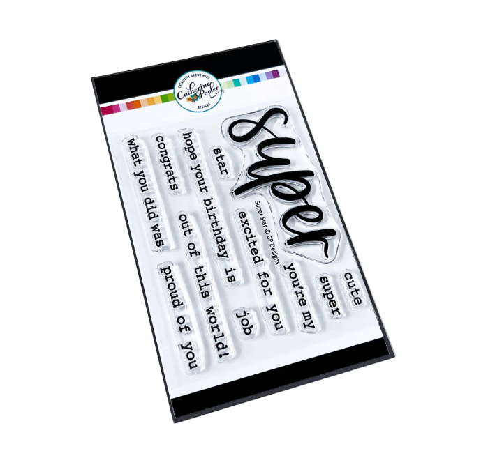 The Super Star Sentiments Stamp Set is super cute! This 3x4 set features a large "super" stamp and secondary words and phrases for lots of sentiment options. "You're my super star", "hope your birthday is super" or "super excited for you"-